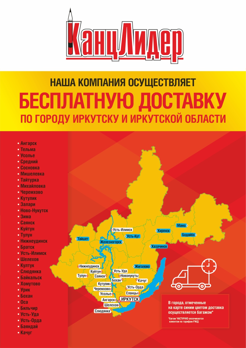 Доставка заказов по Иркутску и Иркутской области осуществляется бесплатно при заказе от 1000 руб. (при условии, что в заказе нет офисной бумаги) и 3000 руб. при заказе с бумагой.